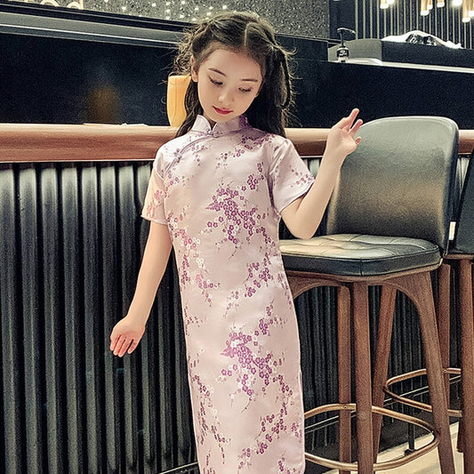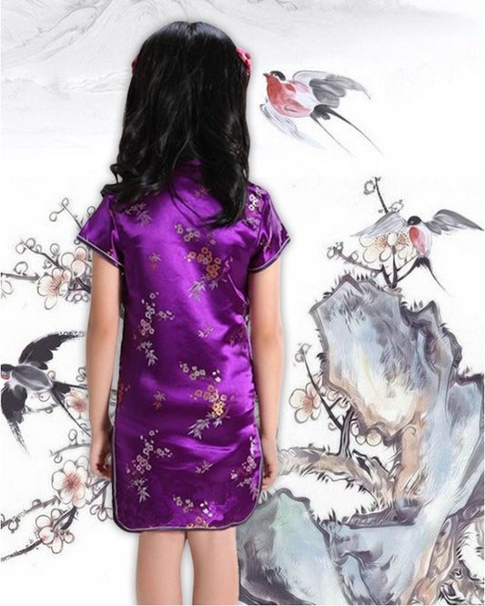 Girls Chinese Charming Purple Cherry Blossom Satin Qipao Cheongsam Dress
