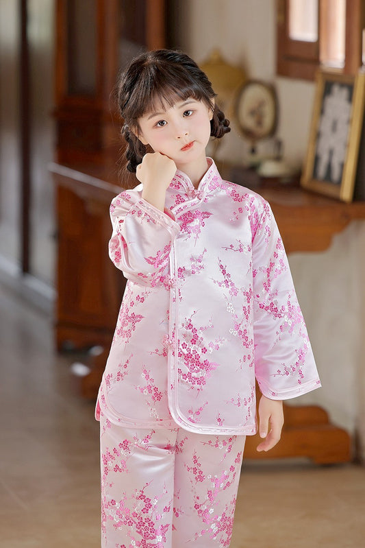 Girls' Pink Satin Chinese Outfit with Cherry Blossom Embroidery and Frog Closure