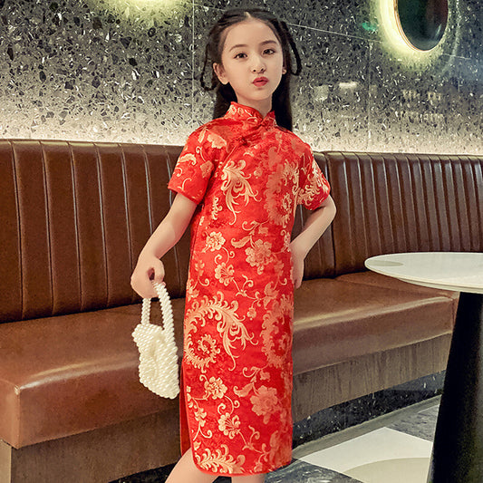 Chinese Oriental Childrens Girls Golden Flower Red Cotton Qipao Cheongsam Dress