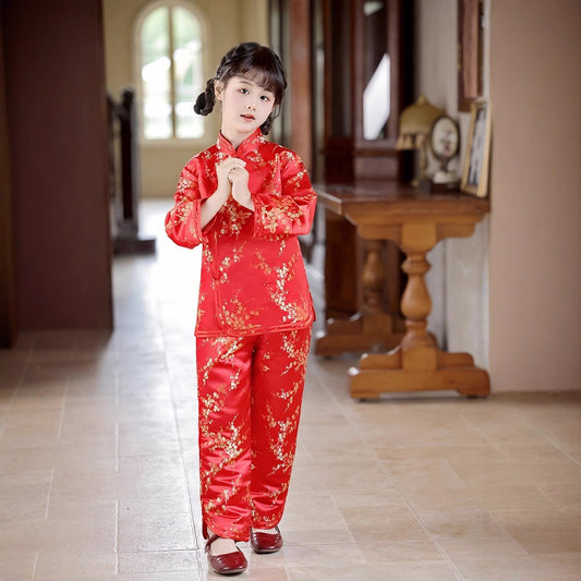 New Girls' Red Chinese Outfit with Gold Cherry Blossom Pattern and Satin Finish