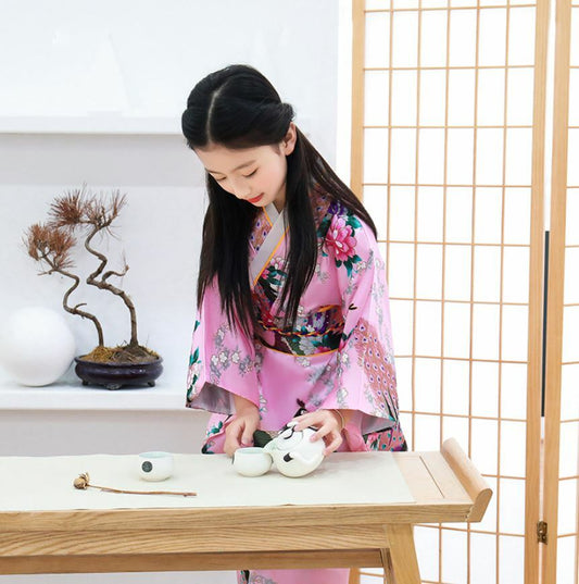 New Japanese Childrens Girls Pink with Flower Prints Long Kimono Outfit gjk5