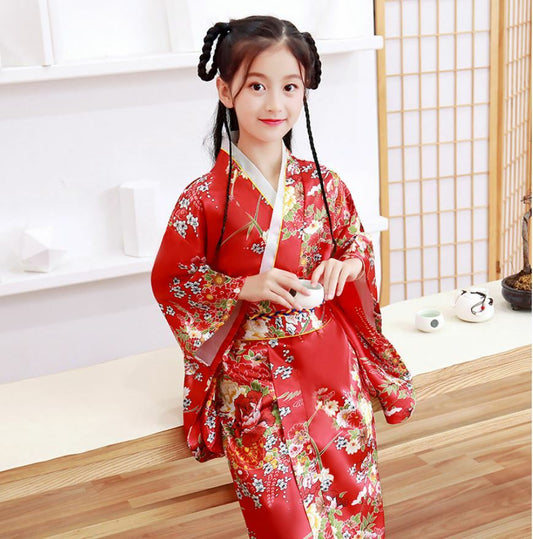 New Japanese Childrens Girls Red Blossom Flower Prints Long Kimono Outfit gjk9