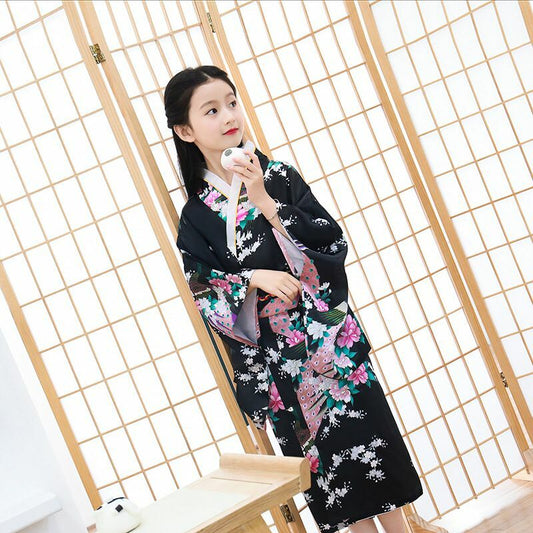 New Japanese Childrens Girls Black with Flower Prints Long Kimono Outfit gjk4