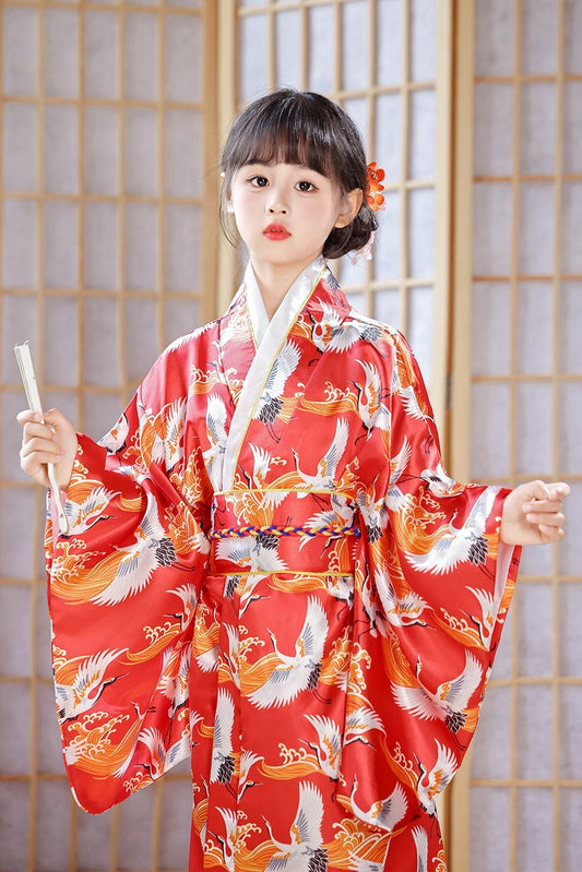 New Japanese Childrens Girls Red with Heaven Cranes Prints Long Kimono Outfit