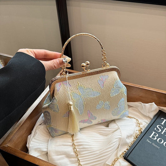 Ivory Brocade Frame Handbag with Chinese Butterfly Embroidery and Tassel