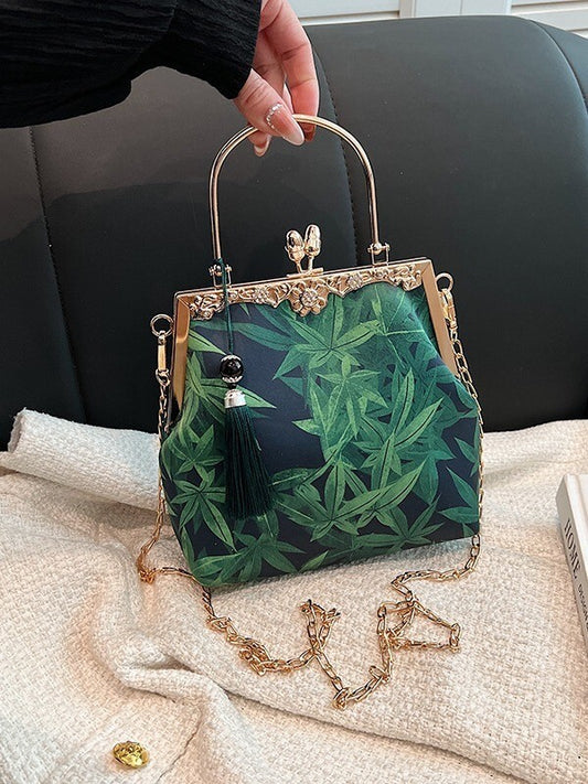 New Elegant Chinese Style Handbag – Green Bamboo Print with Vintage Clasp