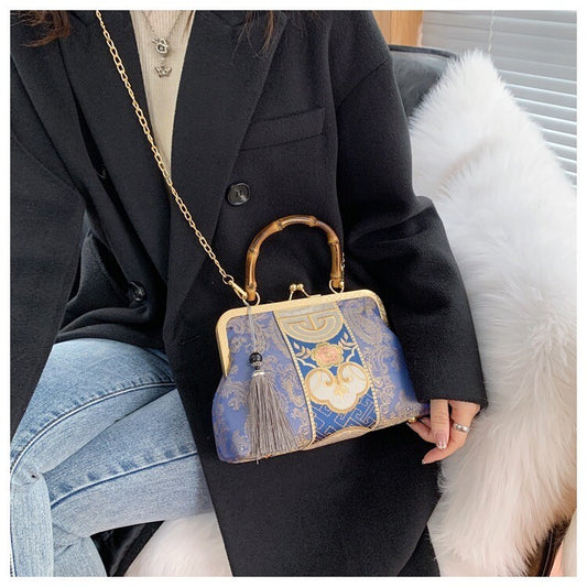 Ladies Chinese Embroidered Royal Charms Evening Clasp Bamboo Shoulder Handbag