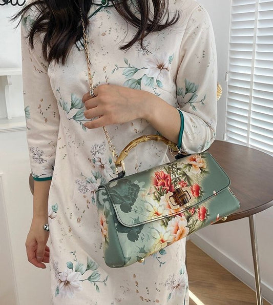 Elegant Chinese Style Green Floral Handbag - Bamboo Handle & Chain Strap