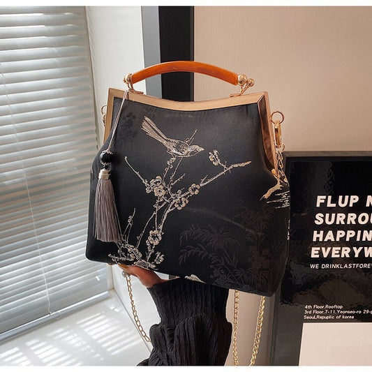 Ladies Chinese Heaven Cranes Royal Charms Evening Clasp Bamboo Shoulder Handbag