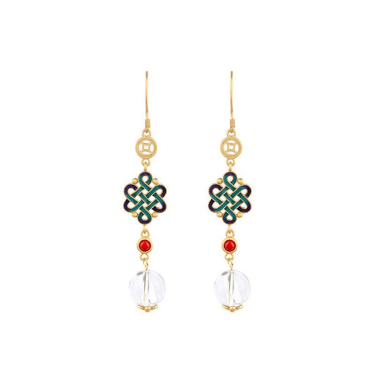 Elegant Chinese Knot Drop Earrings with 24K Gold Plating and White Crystal Beads