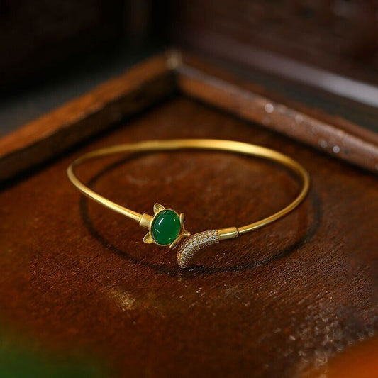 Chinese Jade Fox Bangle - Elegant Gold-Plated Bracelet with Jade and Diamond