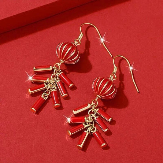 New Ladies Chinese Lucky Red Lantern and Fire Crackers Golden Dangle Earrings