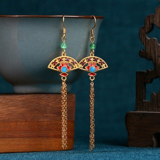 New Chinese Regal Fan-Shaped Tassel Earrings with Turquoise and Coral Beads