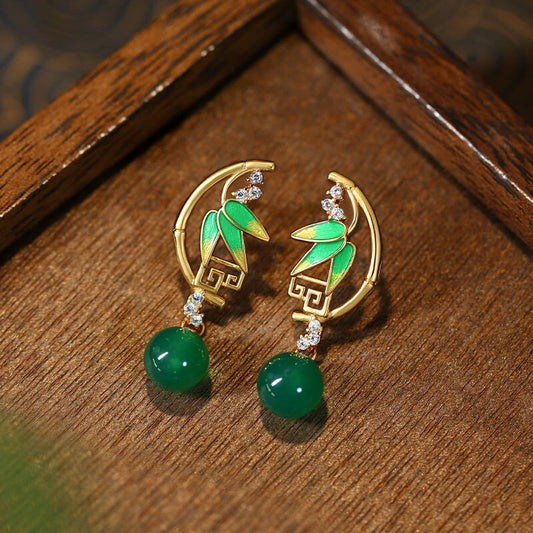 Elegant Chinese Jade Earrings – Gold Plated Bamboo Design with Jade and Gemstone