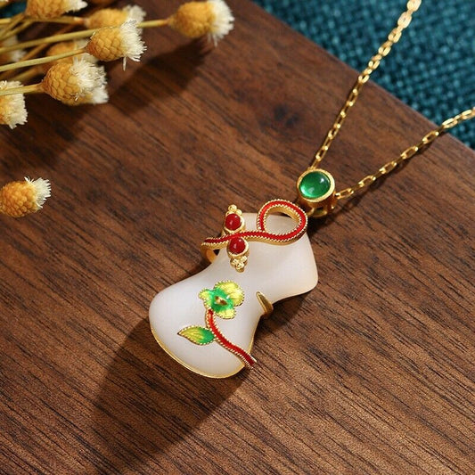 Chinese Ladies Qipao Shaped Gold-Plated Pendant Hetian Jade Enamel Necklace