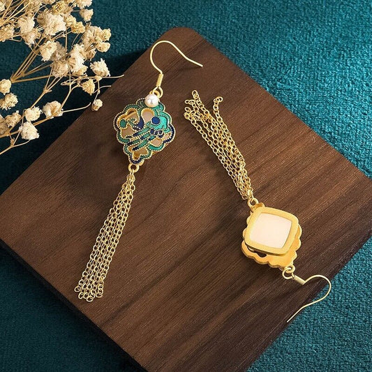 Gold Plated Chinese Royal Palace Style Hetian Jade Tassel & Lucky Lock Earrings