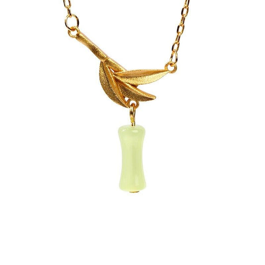 New Chinese Retro Bamboo Faux Green Jade Gold Plated Leaves Pendant Necklace