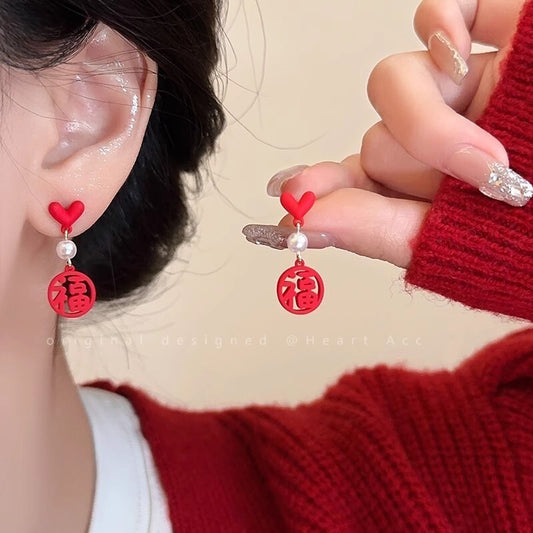New Charming Red Heart & 'Luck' Symbol Chinese Style Drop Earrings for Women