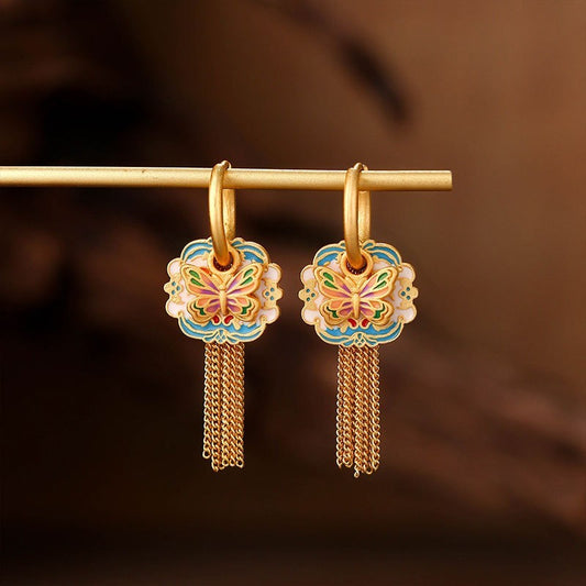 Chinese Style Enamel Butterfly Earrings with Golden Layer and Tassel Chains
