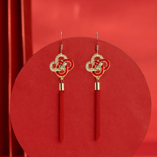 Chinese Golden Knot Lucky Charm Tassel Drop Earrings with Crystal Embellishments