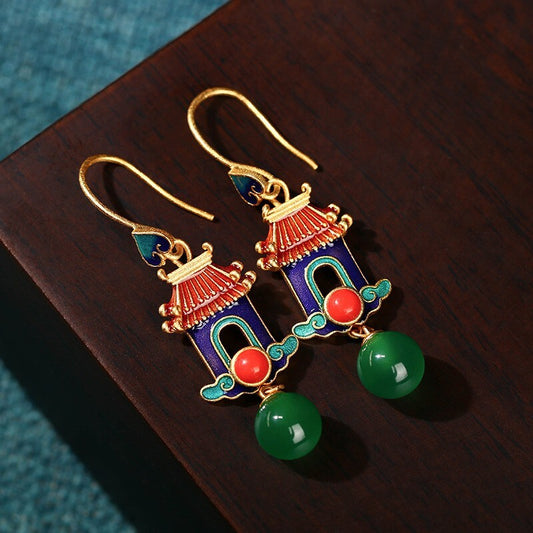 Chinese Enamel GoldPlated Palace Shape Style Natural Green Jade Dangle Earrings