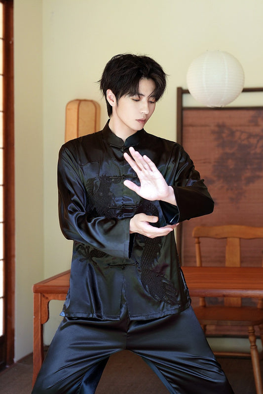Chinese Oriental Mens Martial Kung Fu Black Dragon Pyjamas Pajama Set