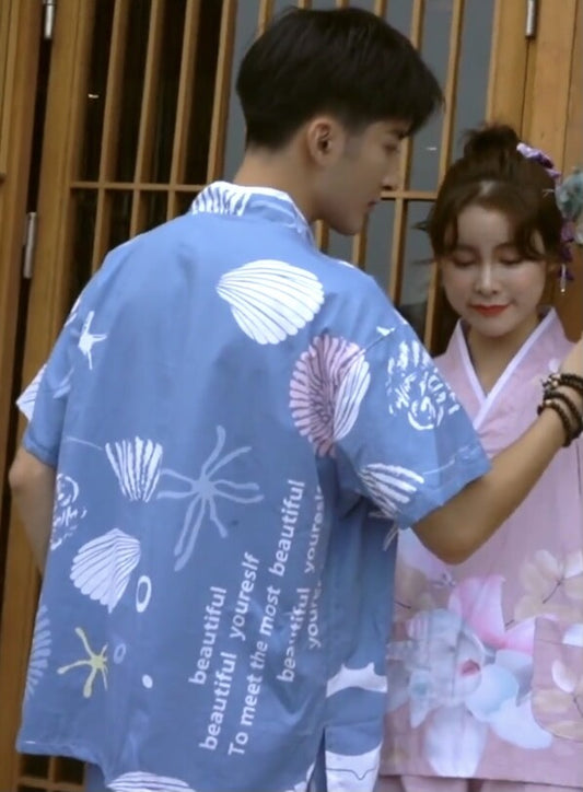 Chinese Japanese Mens Blue Sea Life Top & Shorts Kimono Pyjamas Pajamas menpjs48