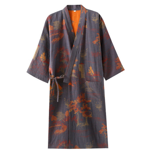 Women's Kimono Muted BlueGrey Dressing Gown – Cotton Robe with Floral Pattern