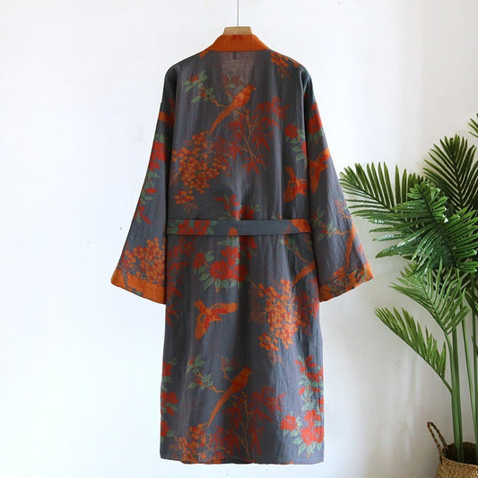 Women's Kimono Muted BlueGrey Dressing Gown – Cotton Robe with Birds Pattern