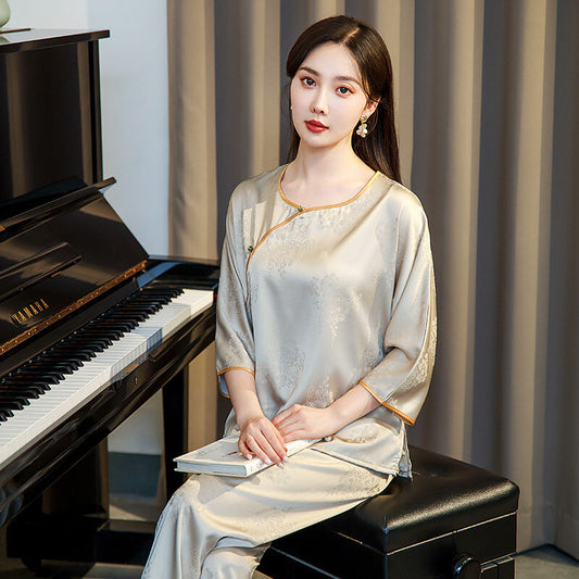 New Elegant ChineseInspired Satin Grey Floral Printing Pyjama Set for Women