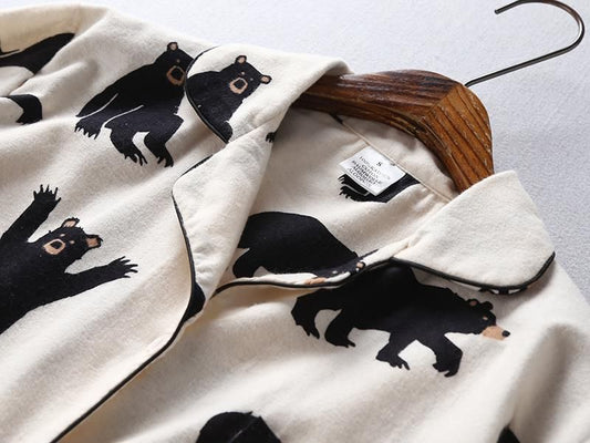 New Ladies Big Black Bears Cotton White Button Up Top & Trousers Pyjamas Pajamas