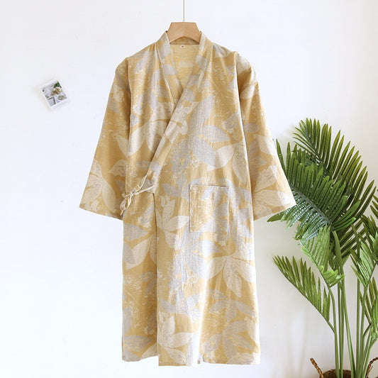 Women's Beige Jacquard Japanese Kimono Robe with Feather and Floral Motif