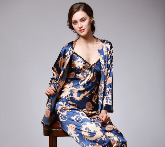 Luxurious Ladies Womens Set of 3 Oriental Golden Dragons Pyjama Pajama
