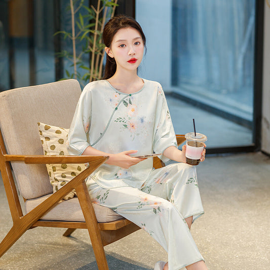 Elegant ChineseInspired Satin Serene Green Floral Printing Pyjama Set for Women