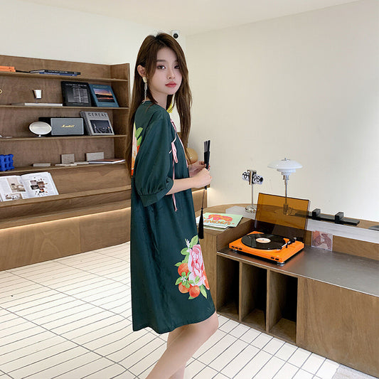 Ladies Dark Green Floral Print Chinese Style Knee Length Nightdress Nightie