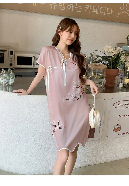 Ladies Light Pink Crane Magnolia Print Chinese Knee Length Nightdress Nightie
