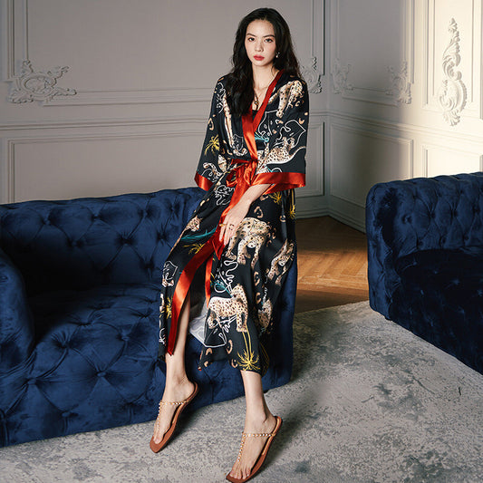 Satin Chinese Japanese Golden Leopards Black Kimono Dressing Gown ladpj393