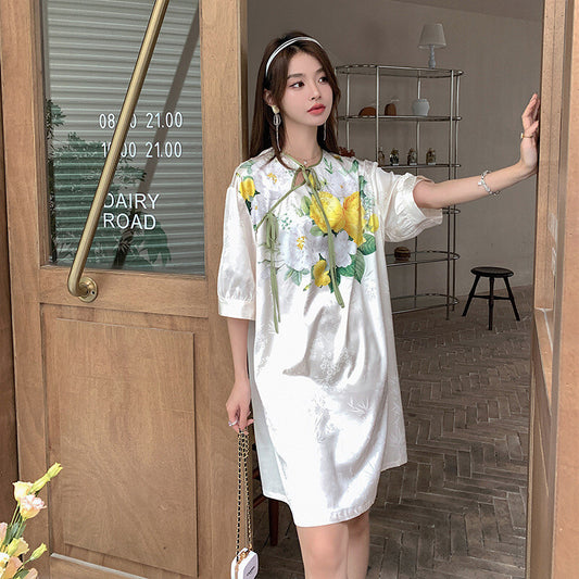 Ladies Ivory White Floral Print Chinese Style Knee Length Nightdress Nightie