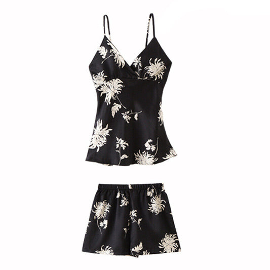 Ladies Black White Flower Prints Cami Vest Top and Shorts Pyjamas Set ladpj352