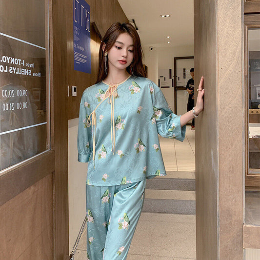Ladies Sky Blue Birds Floral Print Gold Trim Chinese Style Top & Bottom Pyjamas