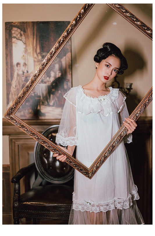 Elegant White Victorian Style Long Sleeve Cotton Ladies Lace Nightdress