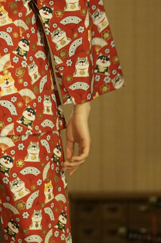 Chinese Japanese Ladies Red Dog Prints Kimono Top and Trousers Pyjamas ladpj349