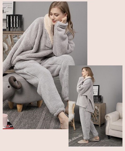 Ladies Luxurious Grey Fluffy Loungewear Pyjamas Set with Cosy Collar and Pockets