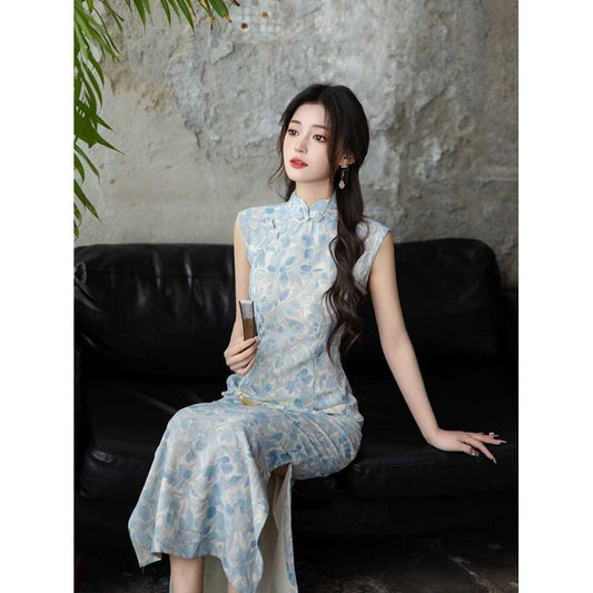 Light Blue Embroidered Chinese Qipao with Pearl Button Detail and Floral Motif