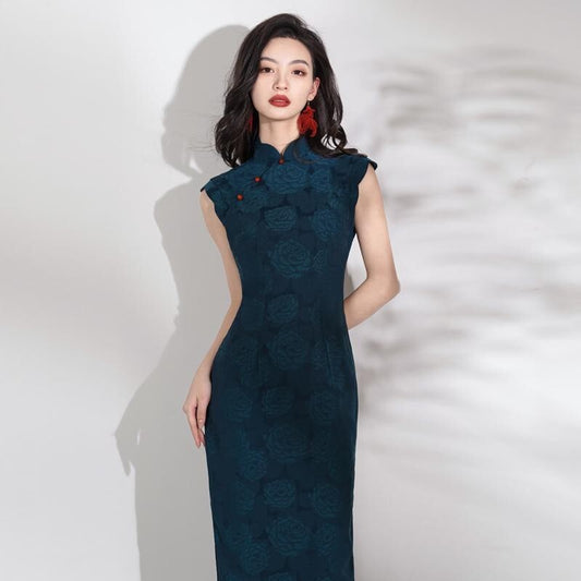 Dark Teal Jacquard Qipao Dress with Red Bead Buttons and Rose Pattern Detailing