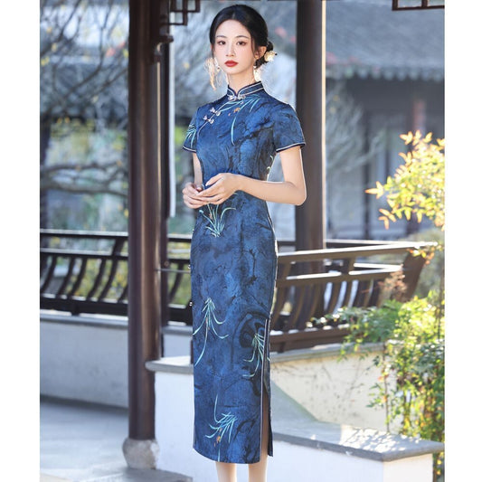 Navy Blue Botanical Chinese Qipao Dress Marbled Texture & Elegant Piping Detail