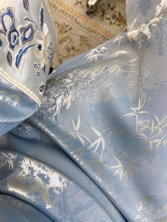 Elegant Pale Blue Brocade Qipao with Embroidered Cuffs and Bamboo Motifs