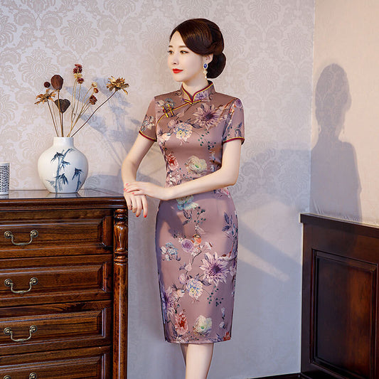 Luxurious Chinese Satin Lilac Peony Floral Prints Short Cheongsam Qipao Dress