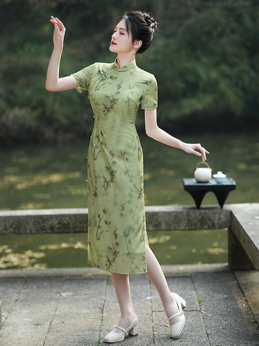 Traditional Ladies Elegant Chinese Bamboo Prints Green Qipao Cheongsam Dress