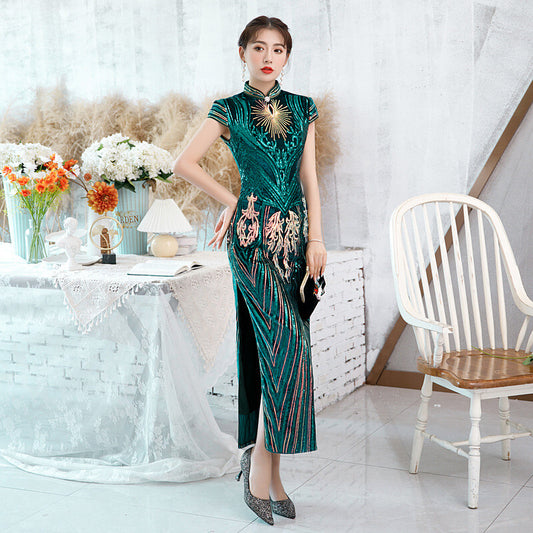 Luxurious Chinese Emerald Green and Gold Sequin Long Dress Cheongsam Qipao